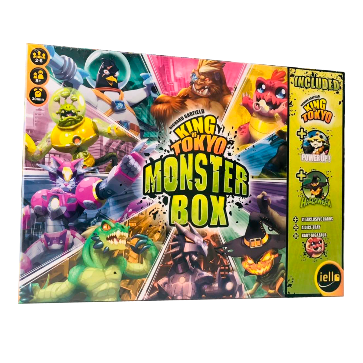 O primeiro a dominar a cidade de Tóquio nunca foi tão competitivo! Esta explosiva Monster Box está cheia de diversão e adrenalina! Obtenha King of Tokyo e todos os seus indispensáveis Power Up! e expansões de Halloween para horas e horas de quebra. Use as cartas de evolução do seu monstro para obter ainda mais propriedades especiais e vesti-las para se divertir ainda mais! A Monster Box também vem com uma versão totalmente nova do Gigazaur, cartas exclusivas e uma nova bandeja de dados, alguns bônus muito necessários para destruir Tóquio em grande estilo!
